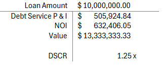To achieve a 1.25 DSCR with the above NOI of $711,778.58 would require the loan amount to be reduced to $7.914,579.91. In other words, the borrower would need to fund $850,545.63 of fresh equity even though the loan balance now represents 68% of value versus 75% for the legacy loan.